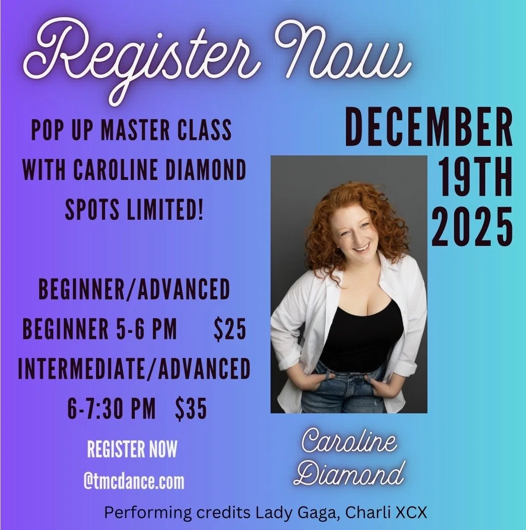 Caroline Diamond Pop Up Master Class: Beginner/Advanced Beginner Friday, December 19, 2025 5:00 PM 6:00 PM The Moving Company Dance Center 9968 York Road Cockeysville, MD, 21030 United States (map) Google Calendar ICS Register Here