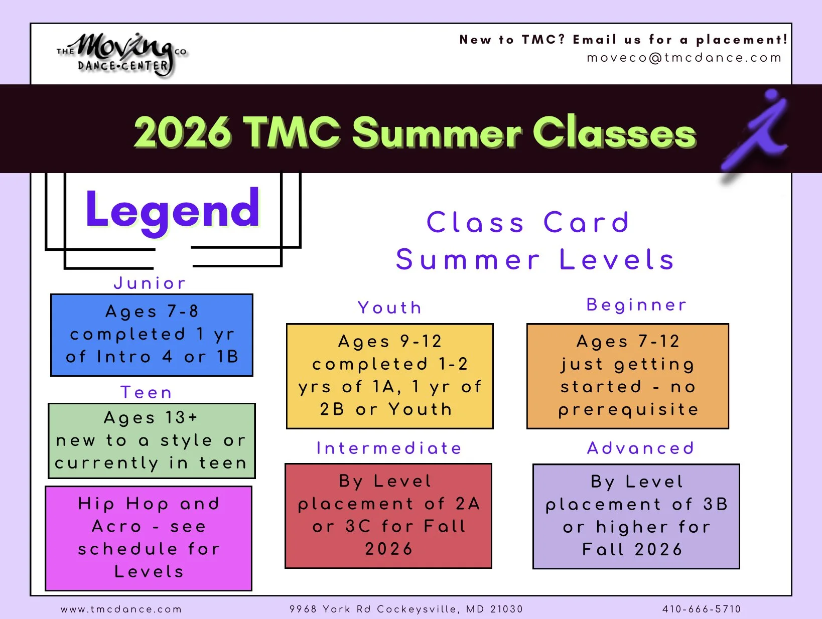 Multi style, level and age-appropriate classes will be offered for 4 weeks this summer at TMC through a new class card system!